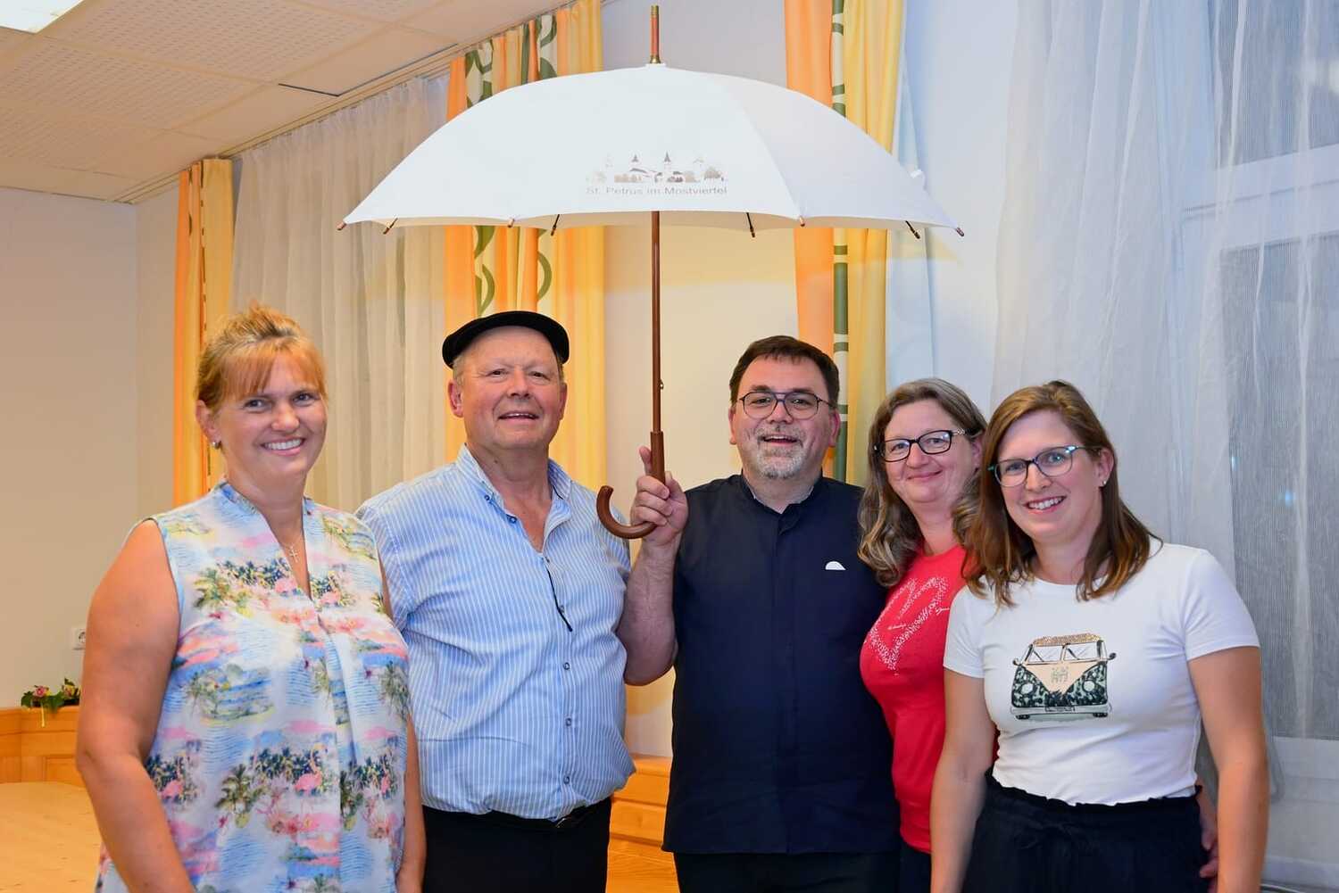 Als Symbol der Dankbarkeit für das Engagement im Pfarrverband, überreichte man einen Regenschirm, auf dem die 4 Kirchen der Pfarrgemeinschaft zu sehen sind.