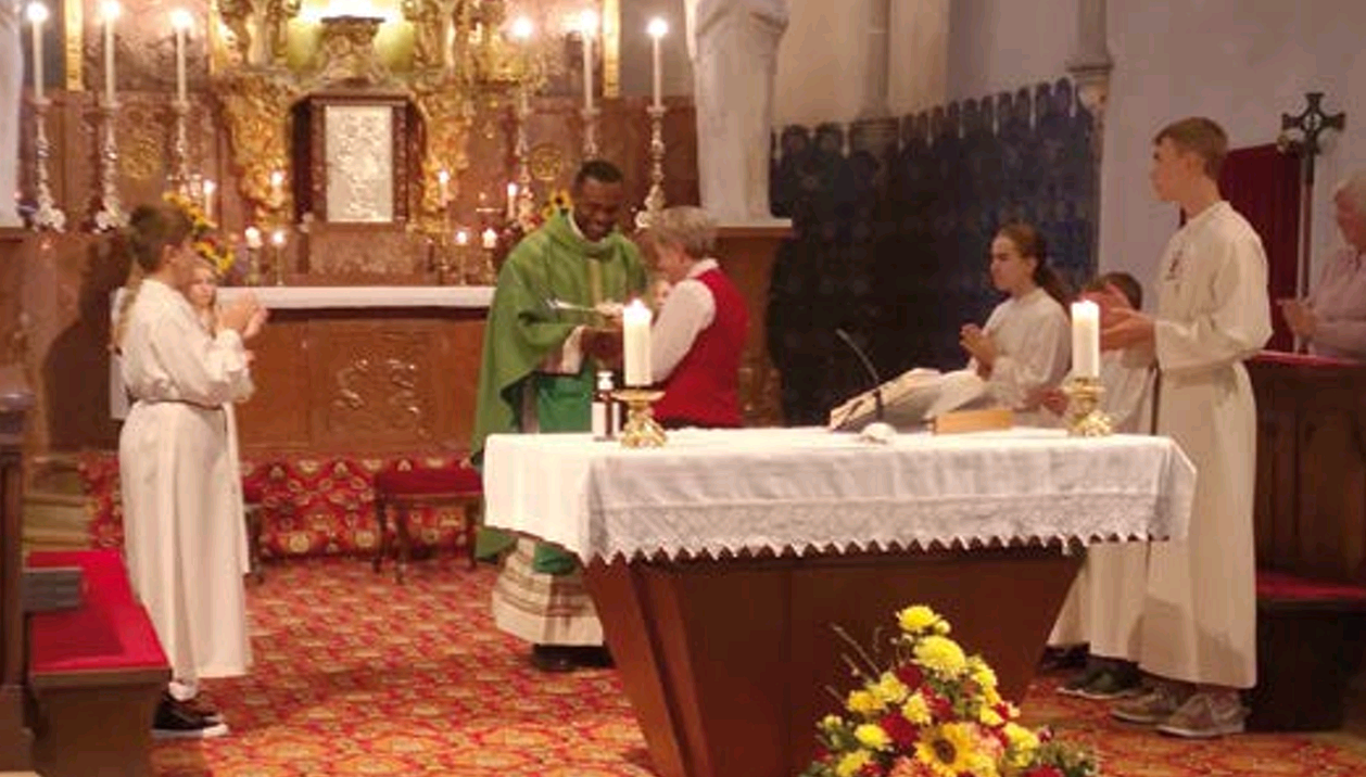 Bei der Abendmesse am 10. September begrüßten wir Kaplan Henry mit einem Kirchenführer und einem Willkommenspaket der Gemeinde. Schön, dass Sie da sind mit Ihrem Gesang und Ihren Geschichten aus der Heimat. Wir wünschen unserem neuen Seelsorgeteam alles Gute und Gottes Segen für ihr Wirken bei uns in der Pfarre.