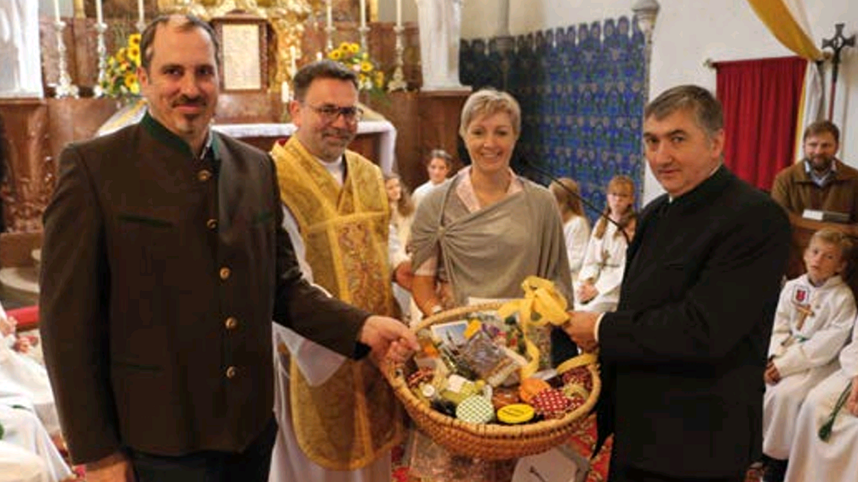 Mit einem Korb, der die Talente und Fähigkeiten des Pfarrgemeinde- und Pfarrkirchenrates hervorheben sollte, begrüßten wir unseren neuen Herrn Pfarrer herzlich. Nach der Messe gab es eine Agape, bei der viele Menschen unserer Pfarrgemeinde mit unserem neuen Pfarrer auf ein gutes Miteinander mit einem Achtel Wein anstoßen konnten.