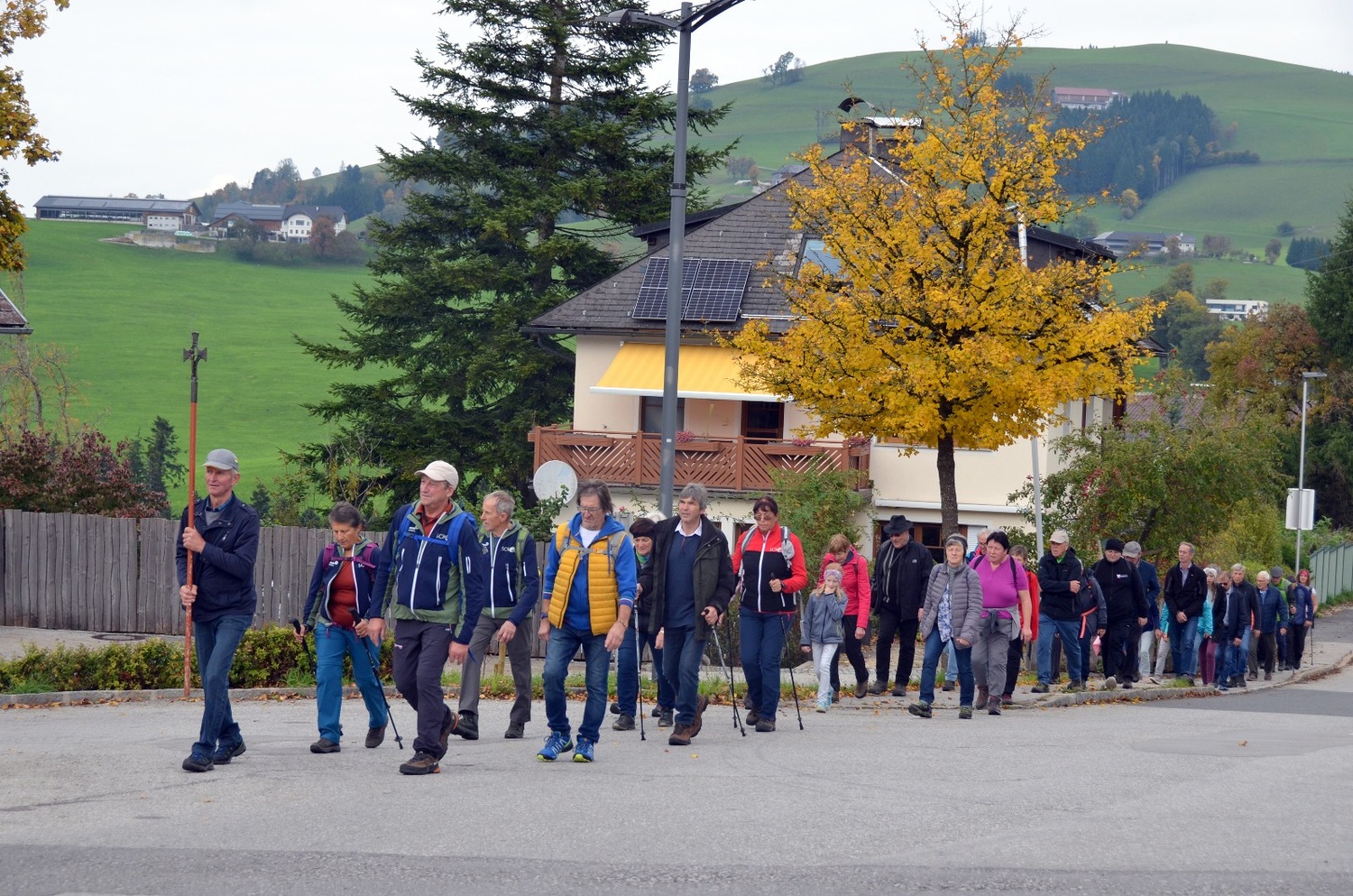 Sonntag frühmorgens am 13. Oktober brachen 18 Wallfahrer mit Gottes Segen von der Pfarrkirche St. Peter in der Au zur Fuß - Wallfahrt nach Maria Neustift auf. Das herbstliche Wetter war ab Mittag ewas nass, was der gute Stimmung nichts anhaben konnte. Traditionell trägt der Erste den Pilgerstab mit dem Kreuz als christliches Zeichen und Gottesglauben. Der Pilgerstab wird auch als der dritte Fuß der Wallfahrer bezeichnet.