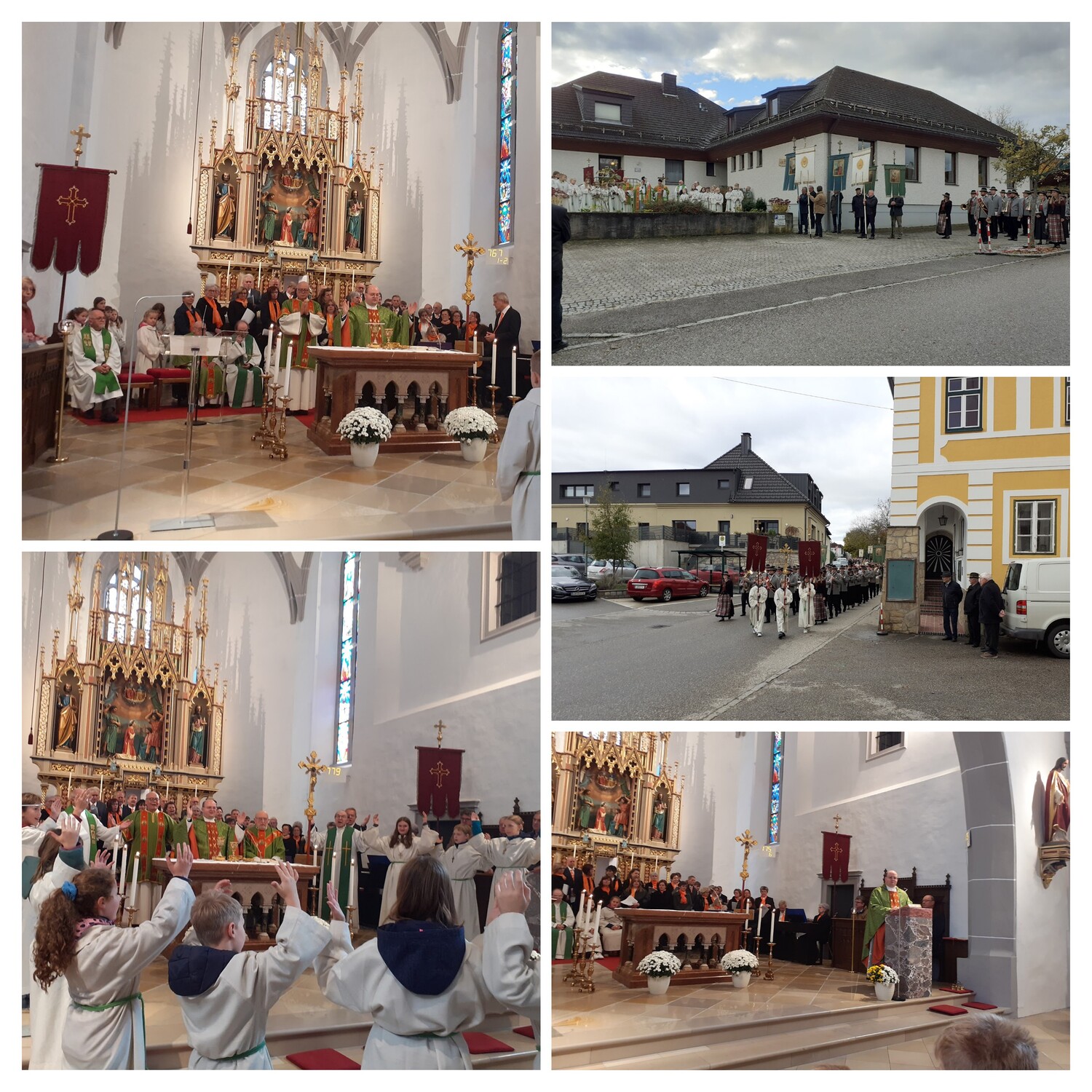 Am Sonntag, 26. Oktober, begannen die Wieder-Eröffnungsfeierlichkeiten beim Pfarrhof, wo während der Renovierung die Gottesdienste stattfanden. Ein besonderer Feiertag dieser Sonntag, sagte unser Pfarrmoderator Mag. Alexander Fischer bei der Begrüßung: Es ist Sonntag, es ist Nationalfeiertag, vor genau 50 Jahren wurde der Pfarrhof eröffnet – und heute ist die Wiedereröffnung der Pfarrkirche nach der Innenrenovierung. Im Festzug ging es dann zur Pfarrkirche, angeführt von der Musik und Kirchenchor, einer großen Schar von Ministrantinnen und Ministranten und fünf Zelebranten. Eine große Menge an Gläubigen folgte und die Kirche war voll, was der Feier ein besonderes feierliches Ambiente gab.