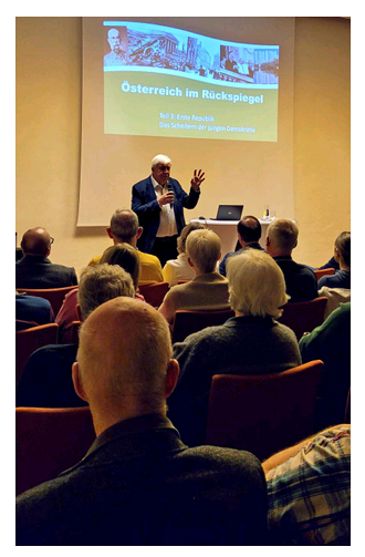 Mit fundiertem Wissen, in mitreißender Art und verständlicher Weise vermittelte HR. Mag. Johann Heuras auch den 4. Teil der Vortragsreihe: Österreich im Rückspiegel – Teil 4: NS-Zeit und 2. Weltkrieg. Das große Interesse ist sowohl der Lebendigkeit im Vortrag und der klaren Darstellung auch komplexer Zusammenhänge durch den Referenten geschuldet. Die Vortragsreihe wird über die Pfarre hinaus angeboten, beispielsweise im Bildungszentrum St. Benedikt in Seitenstetten und im Hippolythaus in St. Pölten.