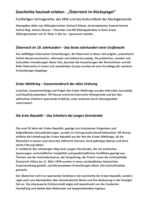 Geschichtliches Wissen hilft, die Gegenwart besser zu verstehen. „Der Weg Österreichs im Rückspiegel“ unter diesem Motto ist vom Katholischen Bildungswerk der Pfarre ab Oktober 2024 eine 5-teilige Vortragsreihe zur Geschichte Österreichs in Vorbereitung. Thematisch reicht der Bogen von Kaiser Franz Josef bis zur 2. Republik. Referieren wird Mag. Johann Heuras. Wir kennen ihn als fundierten Historiker und begeisternden Redner.